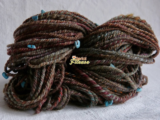 Donc voilà, 10 heures de filage + 3 heures de retors = 390 mètres filés sur l'Aura (ce qui veut dire que j'avais quand même environ 1100 mètres pour 100 grammes (honnête non ?).